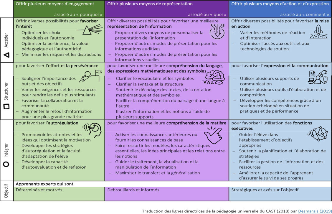 CASTPour l’organisme CAST, les directives du modèle « Universal Design for Learning » (UDL) sont un outil utilisé dans la mise en œuvre de la conception universelle pour l’apprentissage. Il s’agit d’un cadre dont le but est d’améliorer et d’optimiser l’enseignement et l’apprentissage pour tout le monde sur la base des connaissances scientifiques sur la façon dont les humains apprennent. Les directives peuvent être utilisées par les éducateurs, les concepteurs de programmes, les chercheurs, les parents et toute autre personne qui souhaitent mettre en œuvre le cadre dans un environnement d’apprentissage. Les lignes directrices offrent un ensemble de suggestions concrètes qui peuvent être appliquées à toutes disciplines ou tous domaines pour garantir que tous les apprenants peuvent accéder et participer à des opportunités d’apprentissage significatives et stimulantes. | |